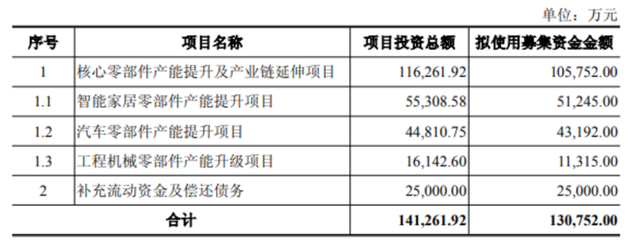 公告显示,核心零部件产能提升及产业链延伸项目由智能家居零部件产能提升项目、汽车零部件产能提升项目、工程机械零部件产能升级项目共有构成,投资总额11.63亿元。公司拟使用募集资金中的10.58亿元用于项目建筑工程、设备投入、基本预备费用及铺底流动资金,剩余部分则以自有资金或自筹方式解决。