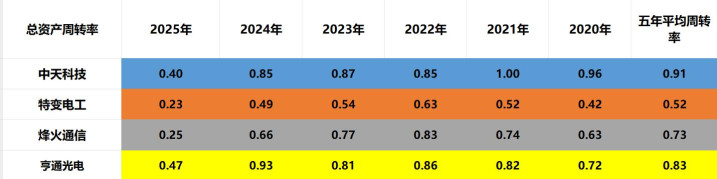 特变动工、烽火通信、亨通光电,三家的周转速度在过去五年上升。