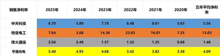中天科技、烽火通信、亨通光电三家的净利率在过去五年上升。