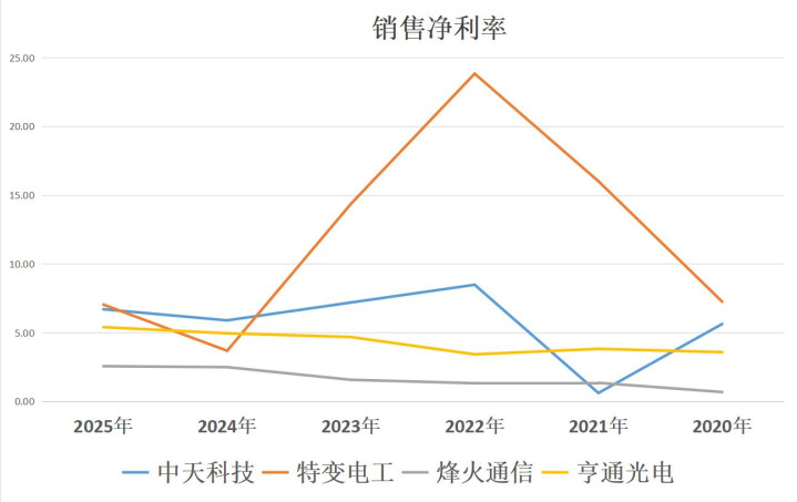 盈利能力:特变电工>中天科技>亨通光电>烽火通信